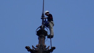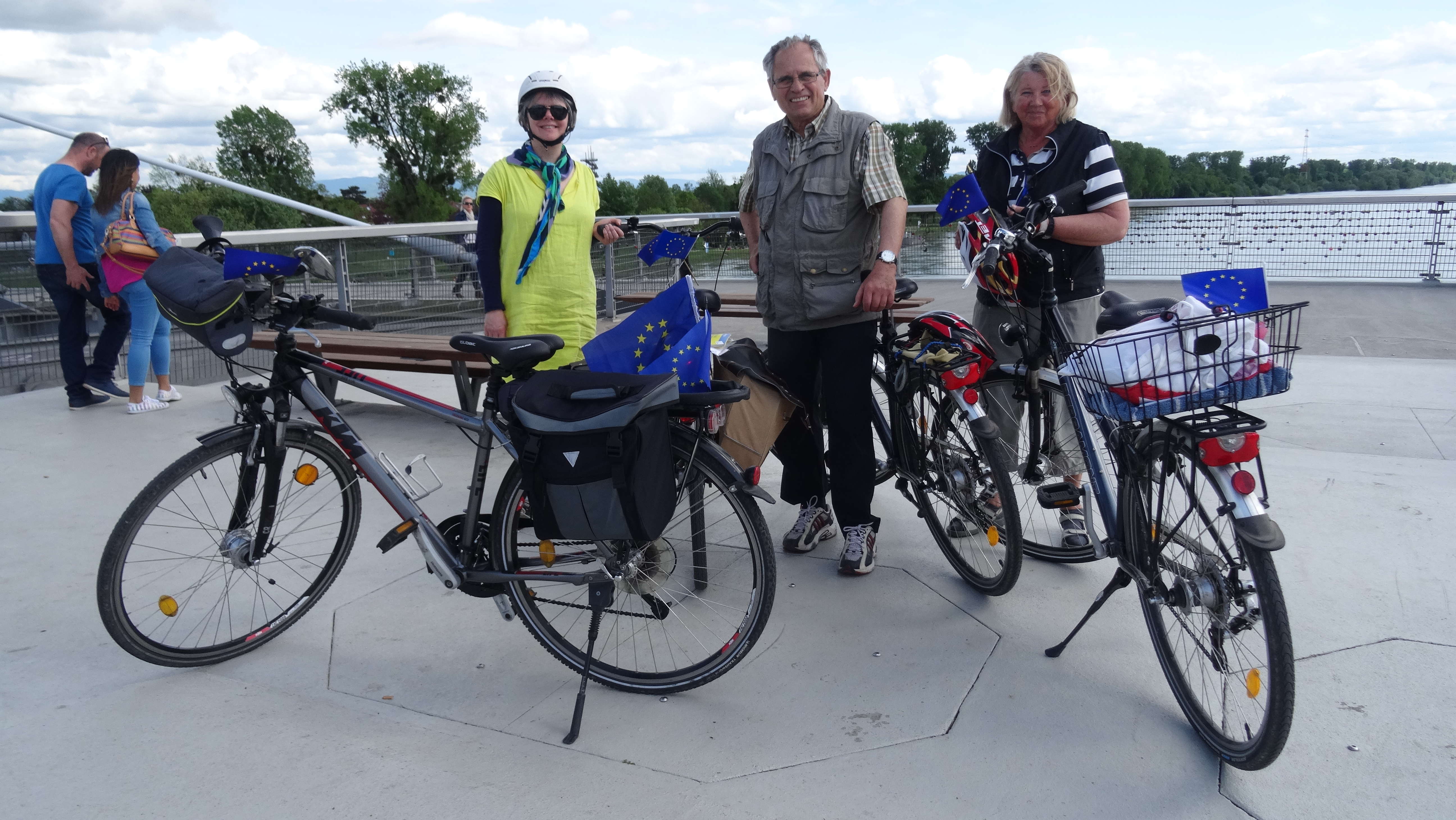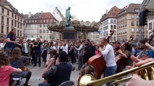 Pour la Journée de l’Europe, Strasbourg fête les 50 ans du drapeau européen en le hissant sur la flèche de la cathédrale. L’Orchestre Universitaire joue l’Hymne à la Joie en « flash mob ». Quatre cyclistes sont partis de Kehl via la Meinau et le parc du Heyritz.